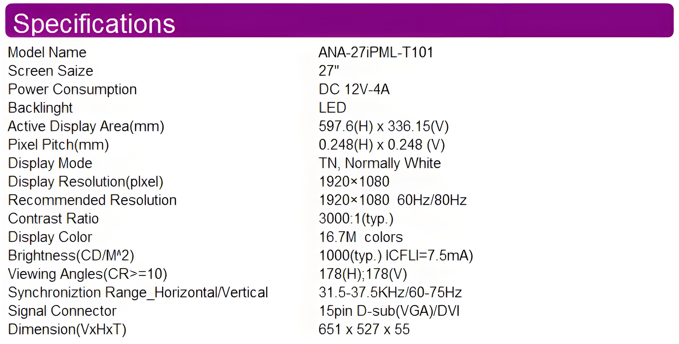 户外专用,温控,光感 尺 寸: 15寸 分辨率: 1024X768(4:3) 可视角: 85/85/85/85(L/R/U/D); 颜色: 16.7M; 亮度: ≥1500cd/㎡; 响应时间: 5ms。 工作温度:40~80C 电容触摸点数:10点 电阻触摸点数: 1点 光感控制,表面IP67, 温控风扇将产品延长2年使用寿命。