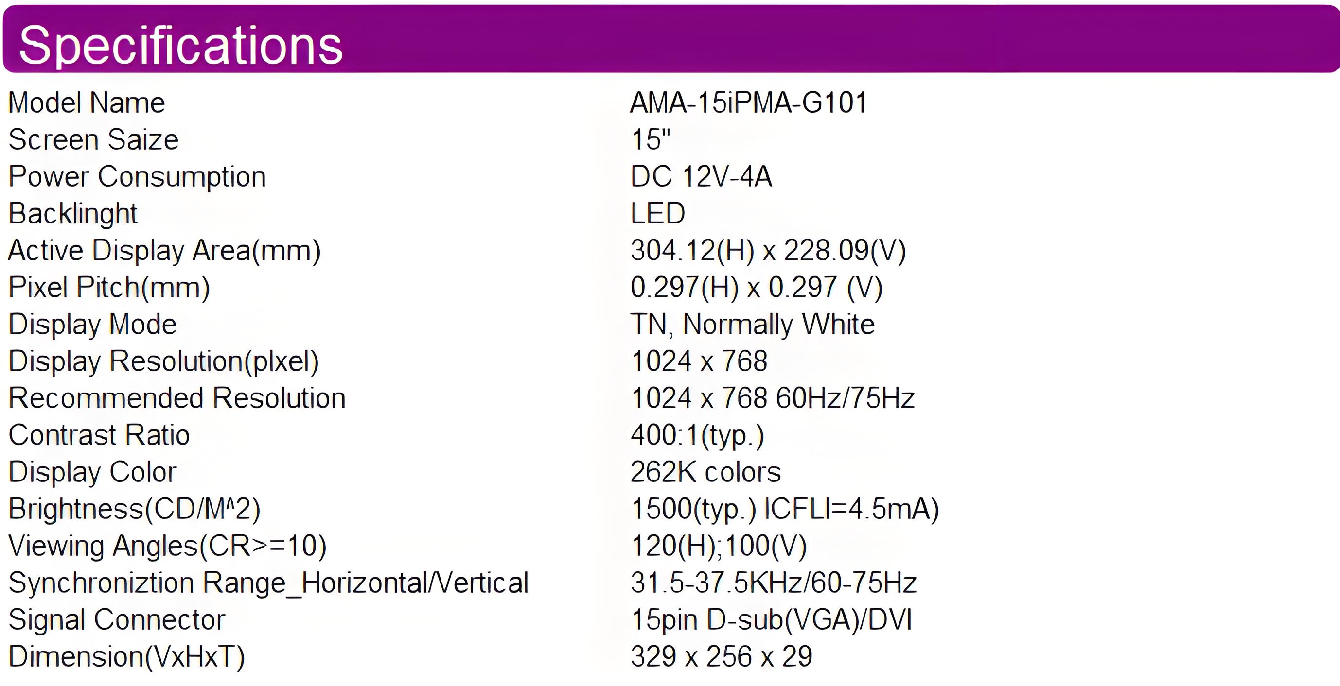 产品特点: 户外专用,温控,光感 尺 寸: 15寸 分辨率: 1024X768(4:3) 可视角: 85/85/85/85(L/R/U/D); 颜色: 16.7M; 亮度: ≥1500cd/㎡; 响应时间: 5ms。 工作温度:40~80C 电容触摸点数:10点 电阻触摸点数: 1点
