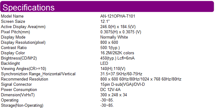 产品特点: 尺 寸: 12.1寸 分辨率: 800X600 1024X768(4:3) 可视角: 85/85/85/85(L/R/U/D); 颜色: 16.7M; 亮度: ≥350cd/㎡; 响应时间: 5ms。 工作温度:30~70C 电容触摸点数:10点 电阻触摸点数: 1点