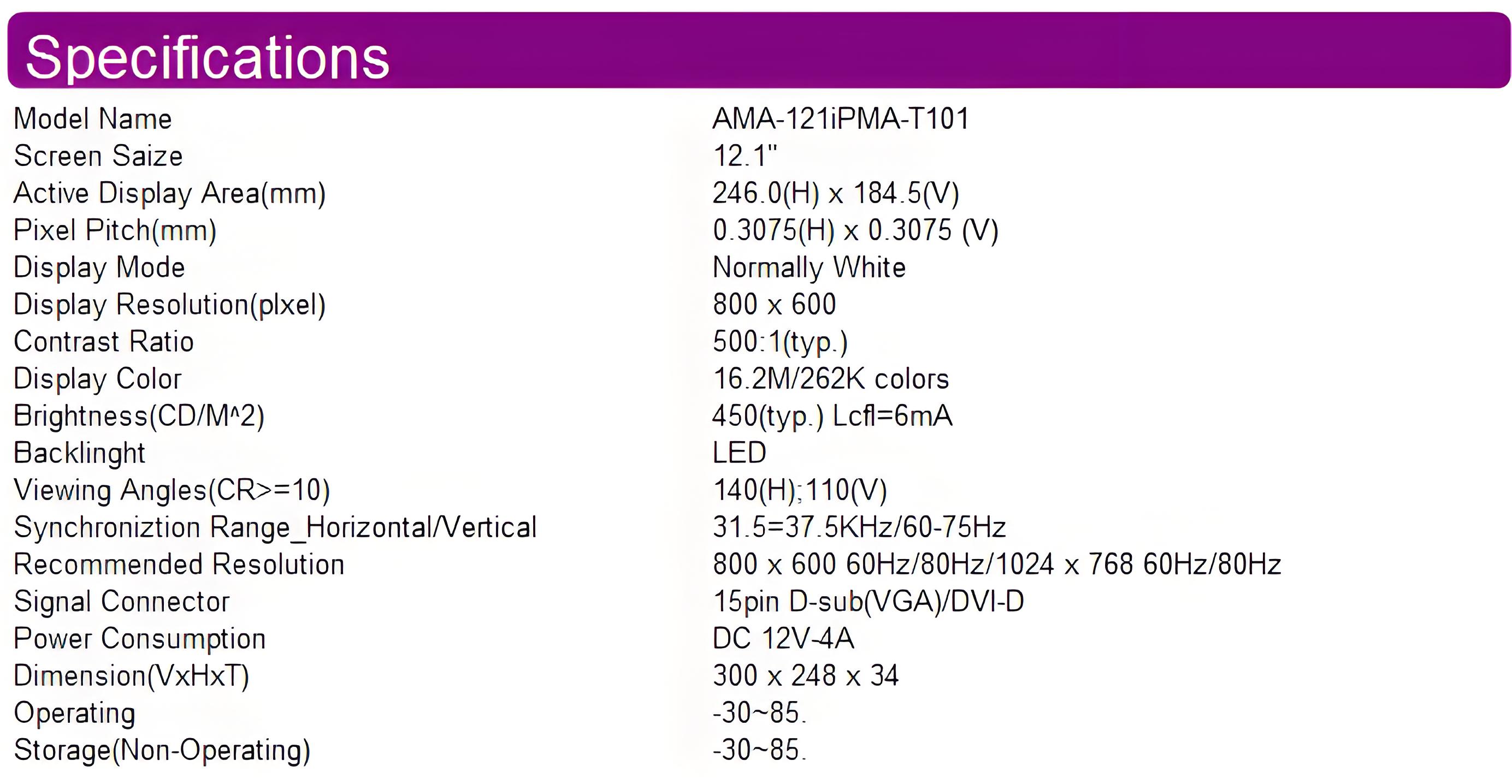 产品特点: 尺 寸: 12.1寸 分辨率: 800X600 1024X768 (4:3) 1280X800; 可视角: 85/85/85/85(L/R/U/D); 颜色: 16.7M; 亮度: ≥350cd/㎡; 响应时间: 5ms。 工作温度:30~70C 电容触摸点数:10点 电阻触摸点数: 1点